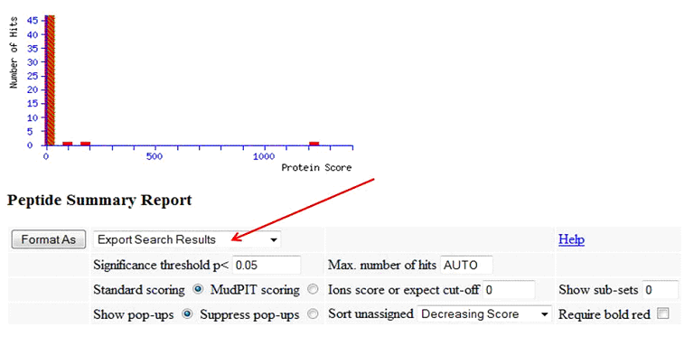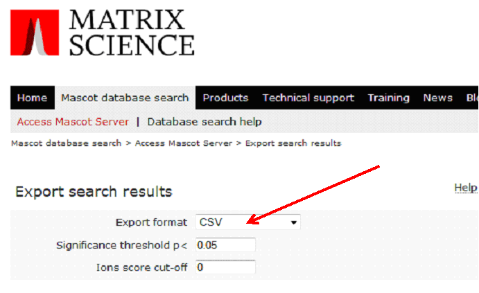 To create a Mascot csv results file, in your Mascot results output, specify 'Export Search Results', then click 'Format As':