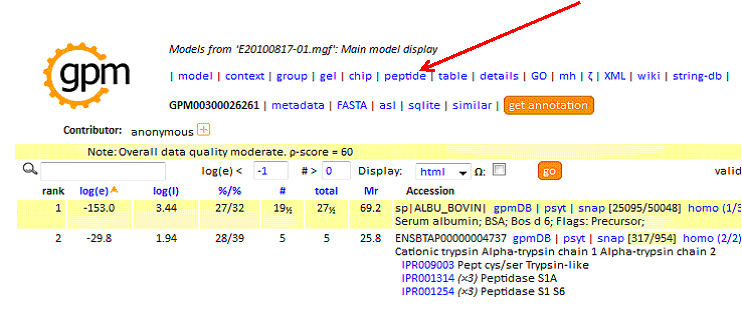 Upon completing your search using X!Tandem you are presented with a protein summary report. To create the tab-delimited text file for MS-Viewer, first click on 'peptide' at the top of the report: