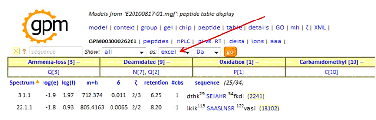 In the peptide report, specify as:'excel', then click 'go' to create the tab-delimited text output: