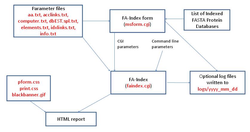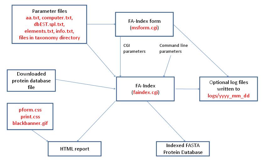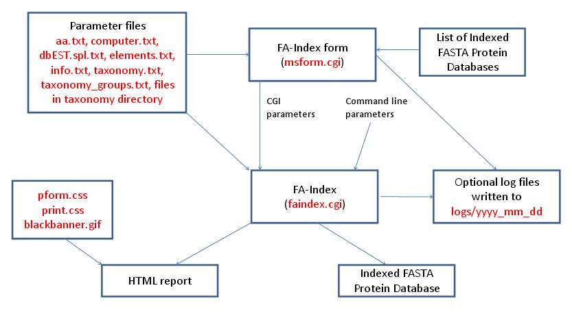 FA-Index is run using the exectuable file cgi-bin/faindex.cgi. The program can either be run from the command line or via a HTML form. The HTML form for running it is generated by the program cgi-bin/msform.cgi. The default form settings are built in. The relevant parameter files when creating indicies for a new database are info.txt, aa.txt, computer.txt, dbEST.spl.txt (dbEST databases only) and elements.txt. The program also requires a FASTA format protein database. The outputs are a HTML report and an indexed protein database for use by the Protein Prospector database search programs. HTML reports use the cascade stylesheet files html/pform.css and html/print.css and the image file html/images/bannerblack.gif. The faindex.cgi and msform.cgi programs can optionally write log files that are written to the directory logs/yyyy_mm_dd.
