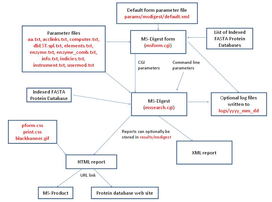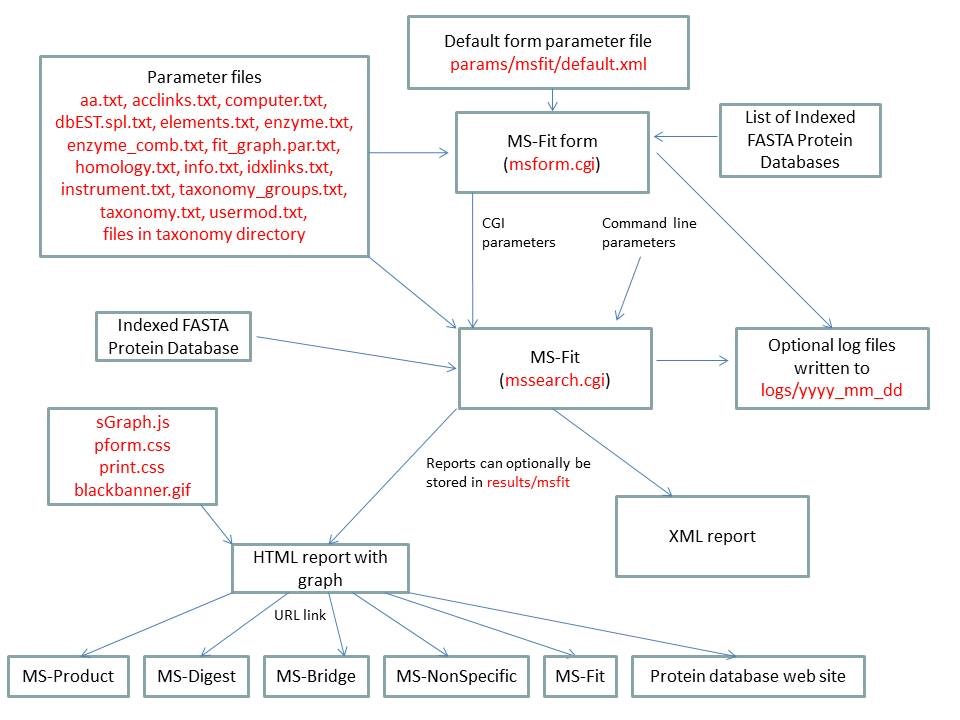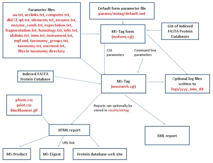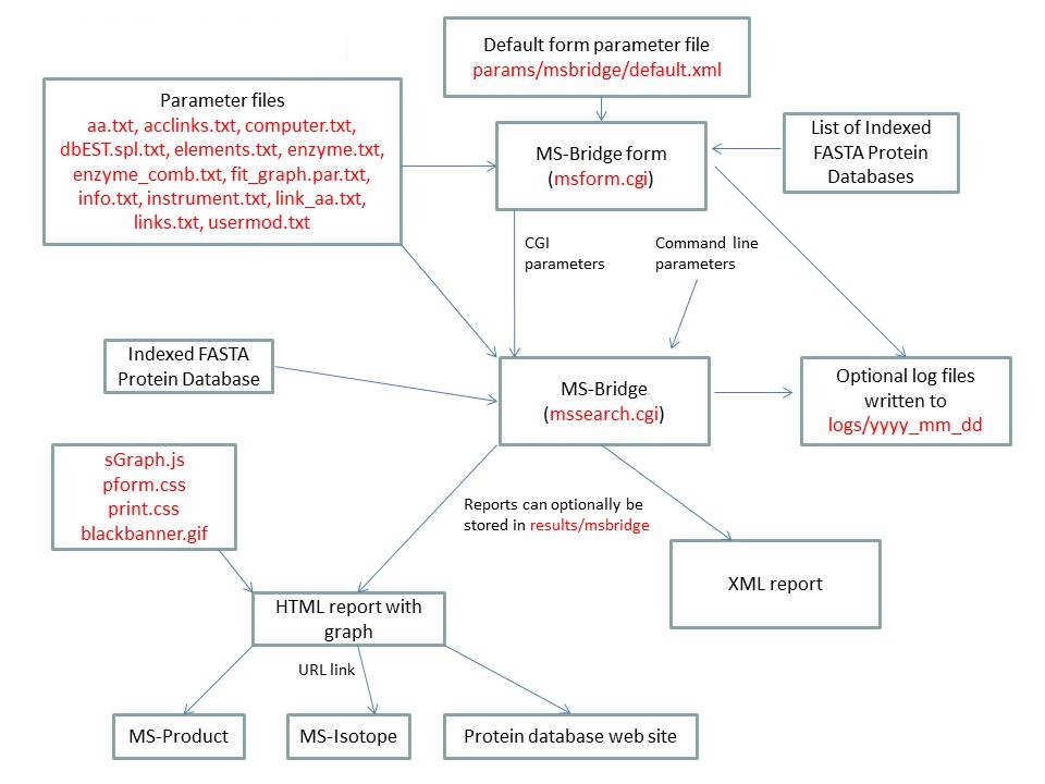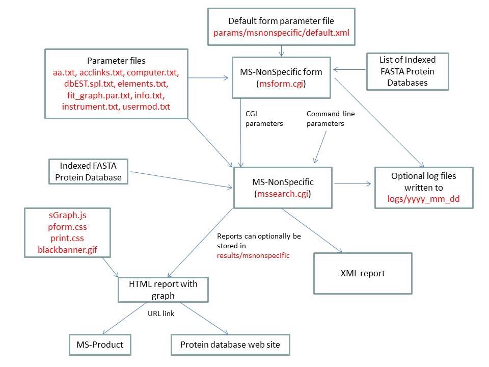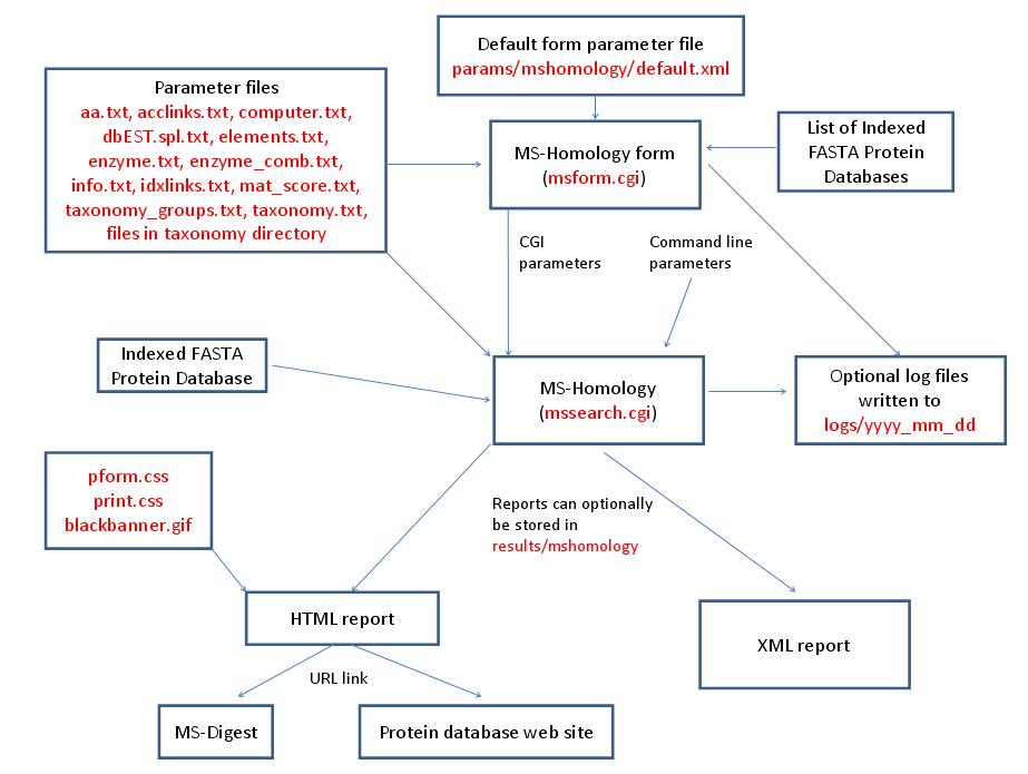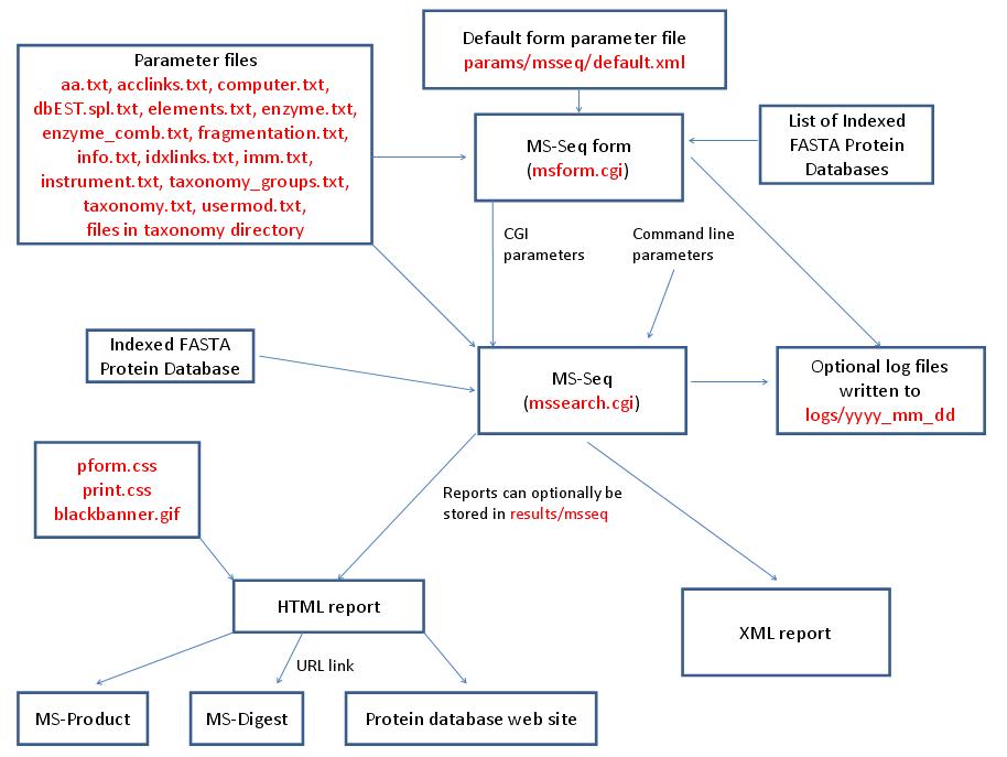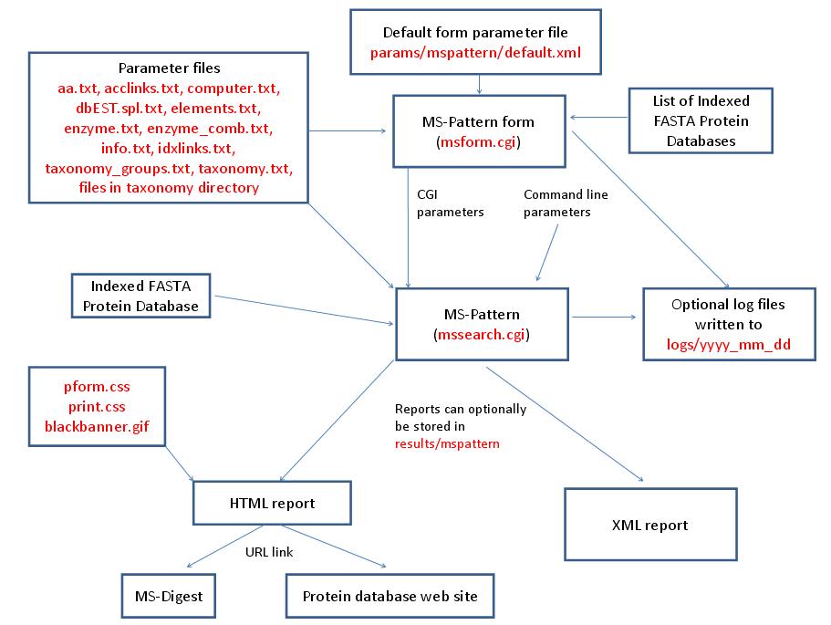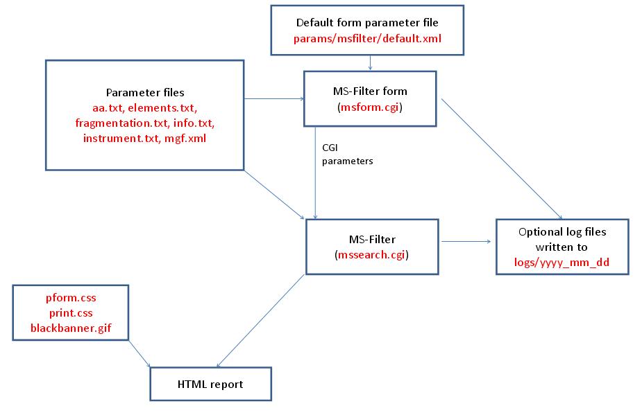 MS-Filter is run using the exectuable file cgi-bin/mssearch.cgi. The program can only be run via a HTML form. The HTML form for running it is generated by the program cgi-bin/msform.cgi. The default form settings are stored in the file params/msfilter/default.xml. The relevant parameter files are info.txt, aa.txt, elements.txt, instrument.txt, fragmentation.txt and mgf.xml. The only possible output formats is HTML. The HTML report makes use of the cascade stylesheet files html/pform.css and html/print.css and the image file html/images/bannerblack.gif. The mssearch.cgi and msform.cgi programs can optionally write log files that are written to the directory logs/yyyy_mm_dd.