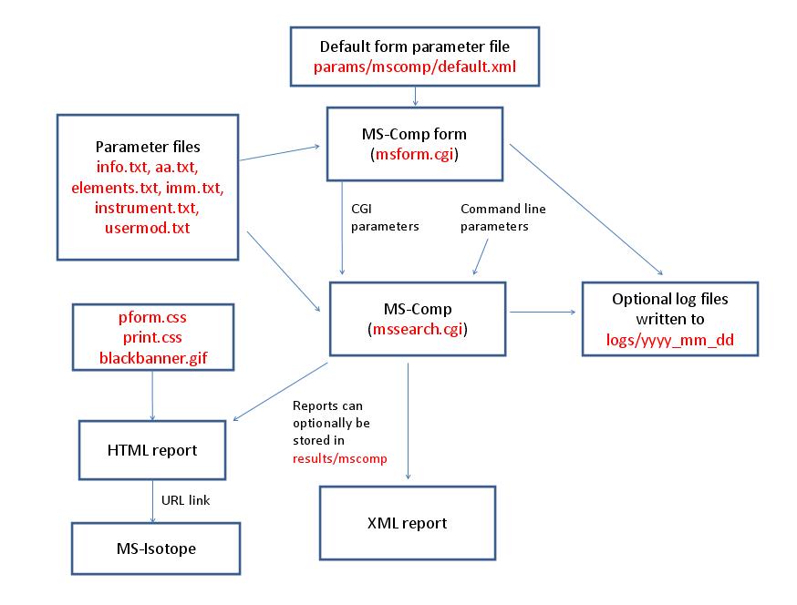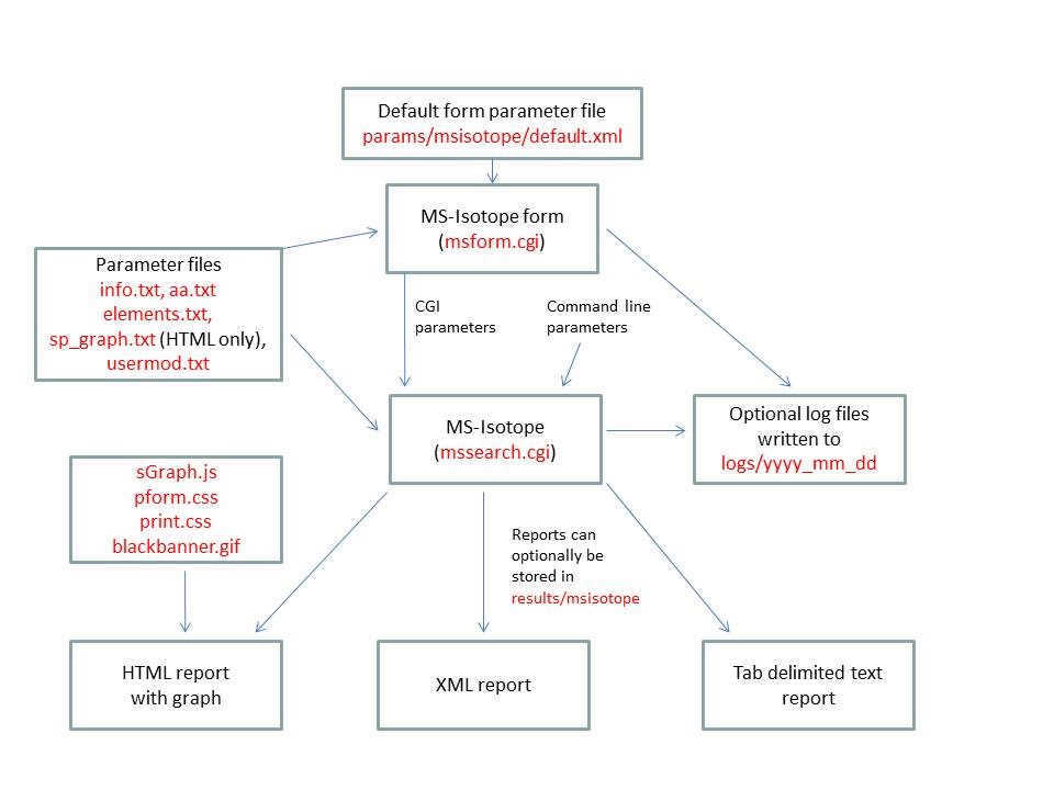 MS-Isotope is run using the exectuable file cgi-bin/mssearch.cgi. The program can either be run from the command line or via a HTML form. The HTML form for running it is generated by the program cgi-bin/msform.cgi. The default form settings are stored in the file params/msisotope/default.xml. The relevant parameter files are info.txt, aa.txt, elements.txt, sp_graph.par.txt and usermod.txt. Possible output formats are HTML, XML or Tab delimited text. The HTML report makes use of the Javascript file html/js/sGraph.js, the cascade stylesheet files html/pform.css and html/print.css and the image file html/images/bannerblack.gif. If the output is written to a file rather than to the standard output then the file is stored in the directory results/msisotope. The mssearch.cgi and msform.cgi programs can optionally write log files that are written to the directory logs/yyyy_mm_dd.
